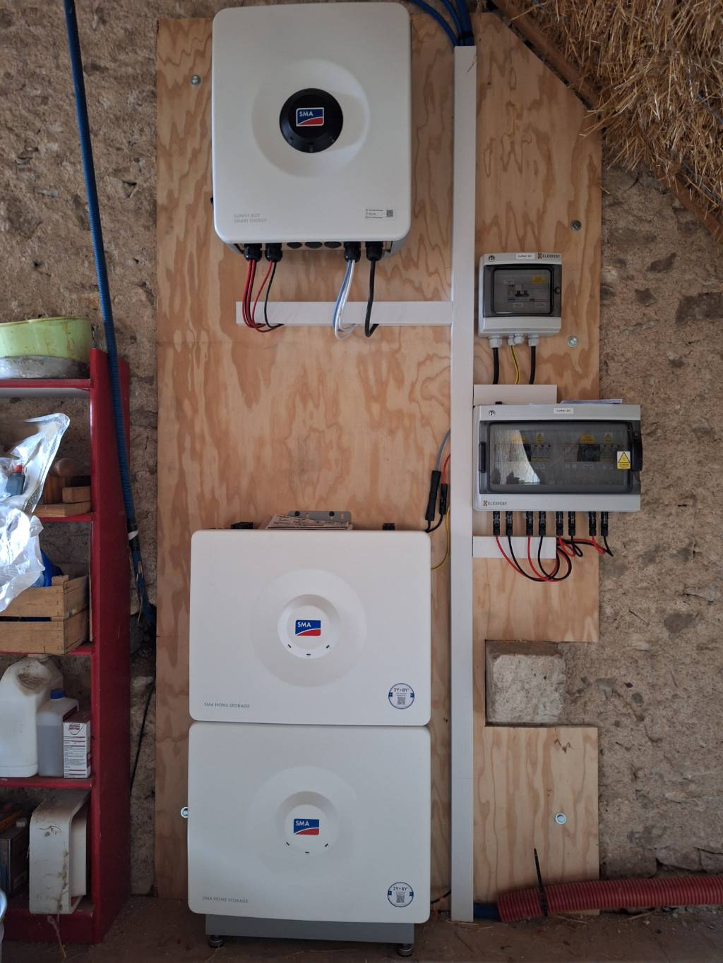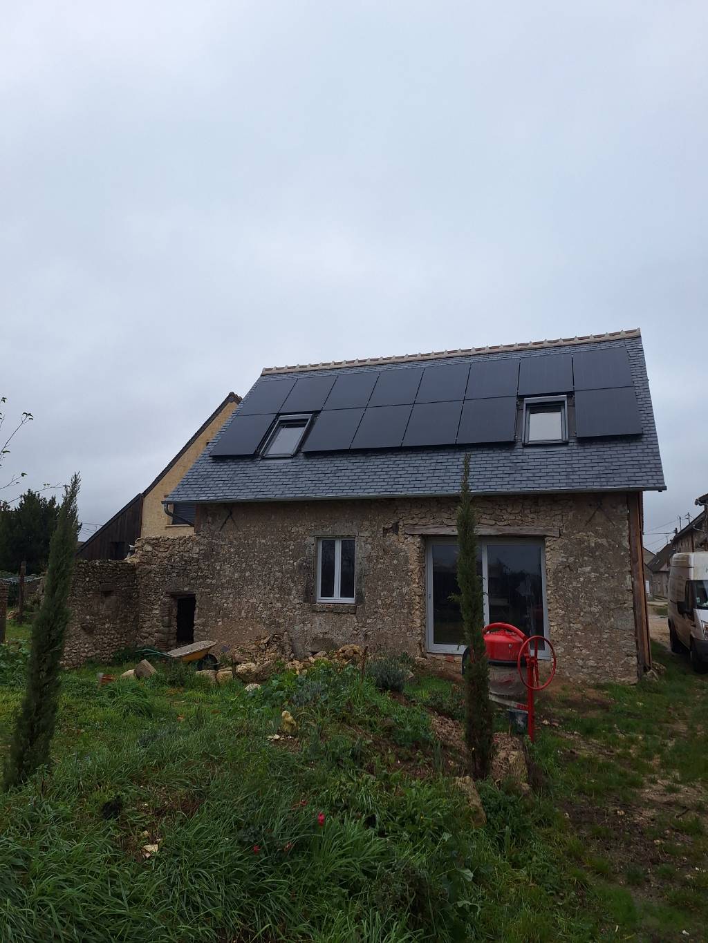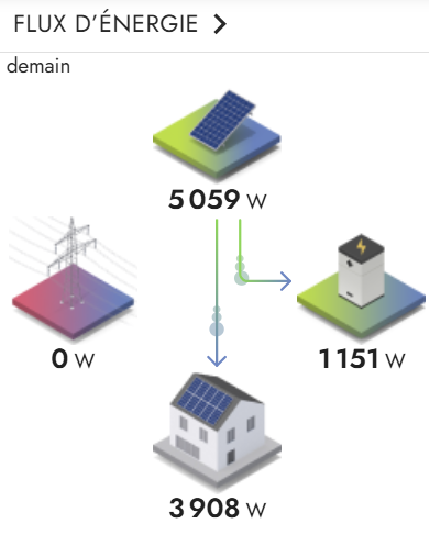 Sur une maison en rénovation, installation d'une production photovoltaïque de 6000Wc associée à une batterie de stockage de 6,5 kWh pour utiliser l'excédent de la journée lorsque la production devient inférieure à la consommation.