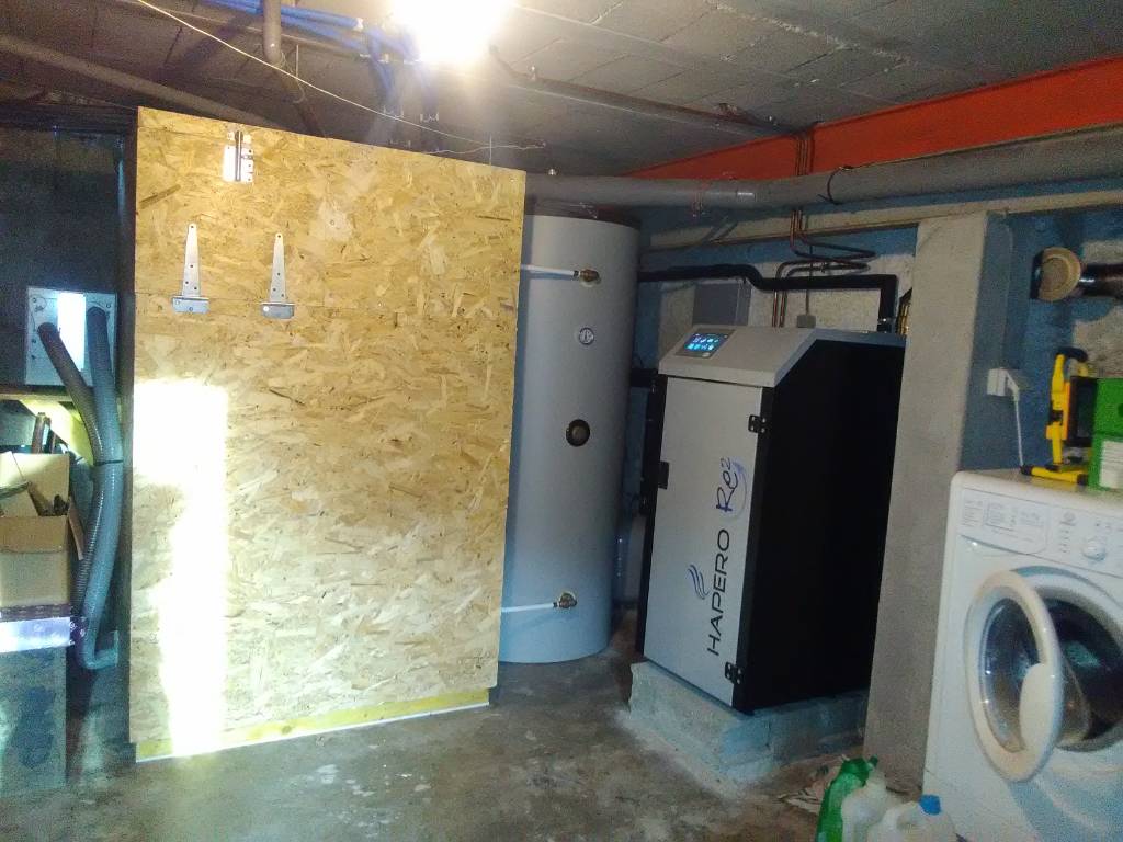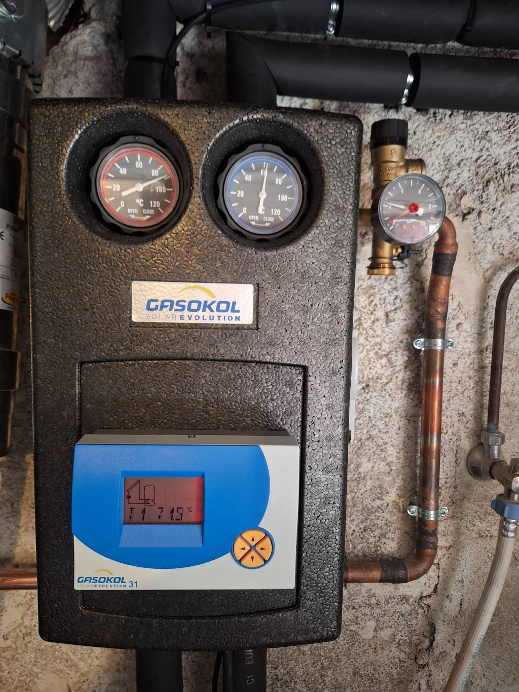 Après l'installation d'une chaudière à granulés de bois (pellet) en 2020, ajout d'un capteur solaire thermique GASOKOL de 7m² intégré en toiture, en raccordement sur le ballon tampon de la chaudière, initialement équipé d'un échangeur.