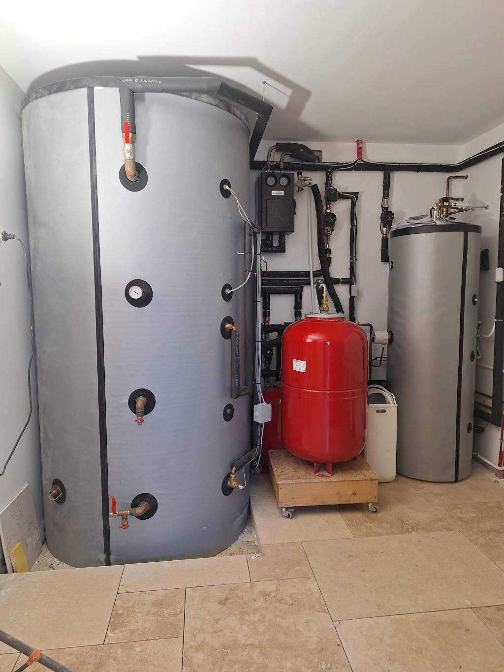 Dans une maison en rénovation, installation d'une chaudière HERZ FS20 kW à bûches avec ballon tampon de 2000 litres, pour le chauffage et le production d'eau chaude sanitaire.